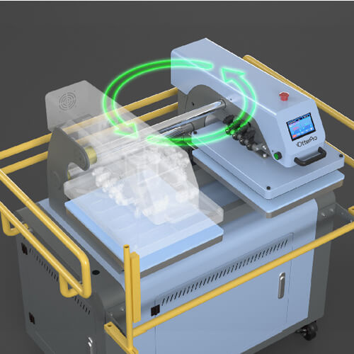 Automatyczny układ pneumatyczny z wbudowaną sprężarką powietrza. Precyzyjne pozycjonowanie podczerwieni. Automatyczne przesuwanie i drukowanie. Bariera bezpieczeństwa wokół prasy termicznej. Wyposażona w 4 kółka obrotowe, łatwe do przesuwania.
